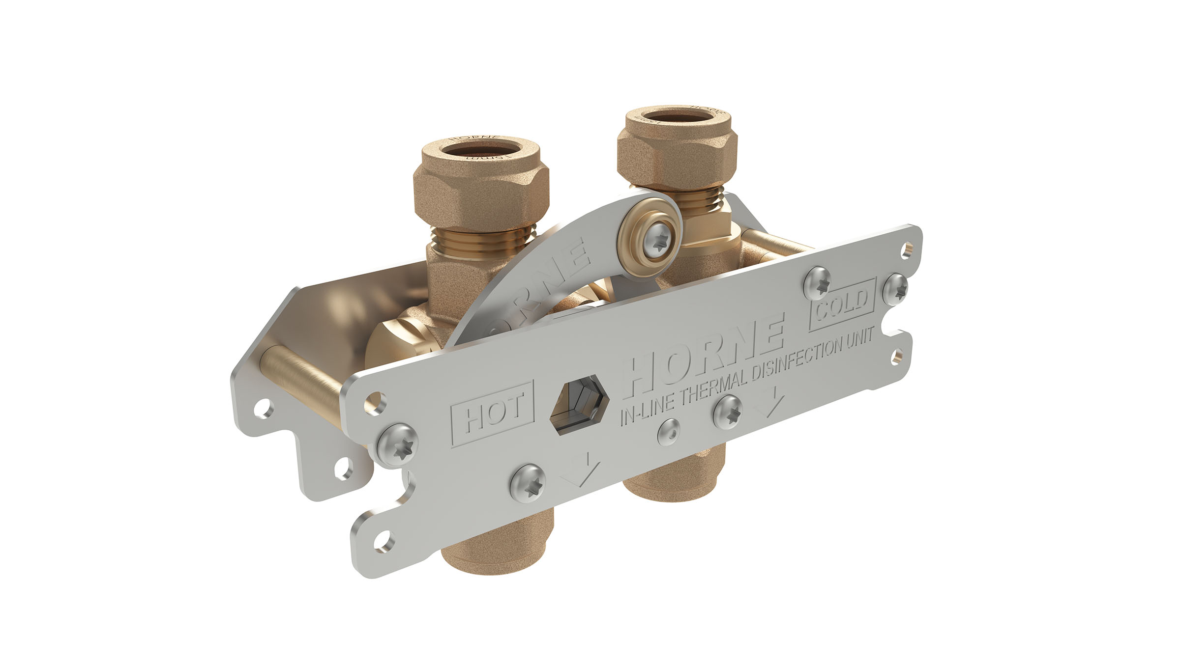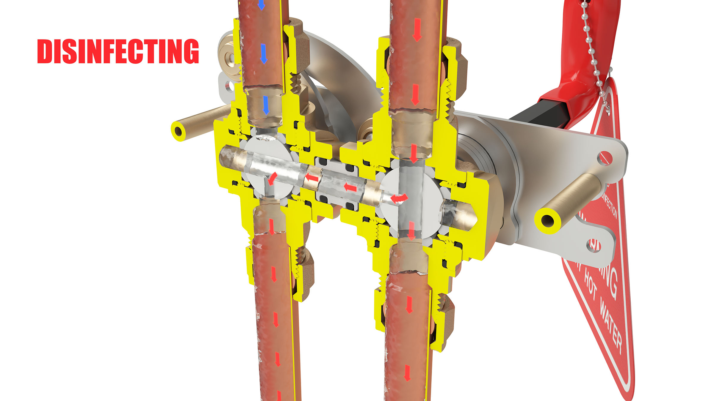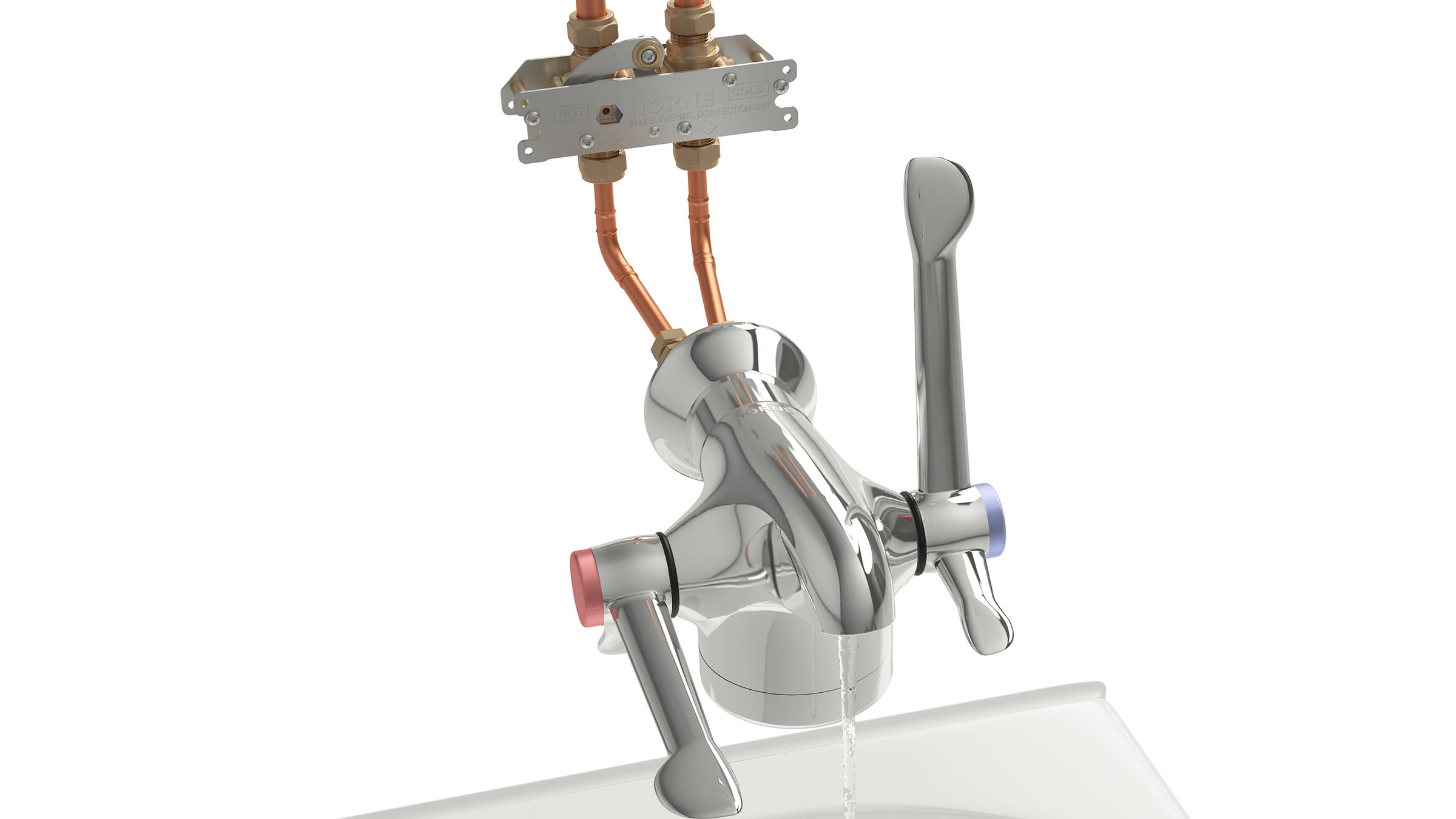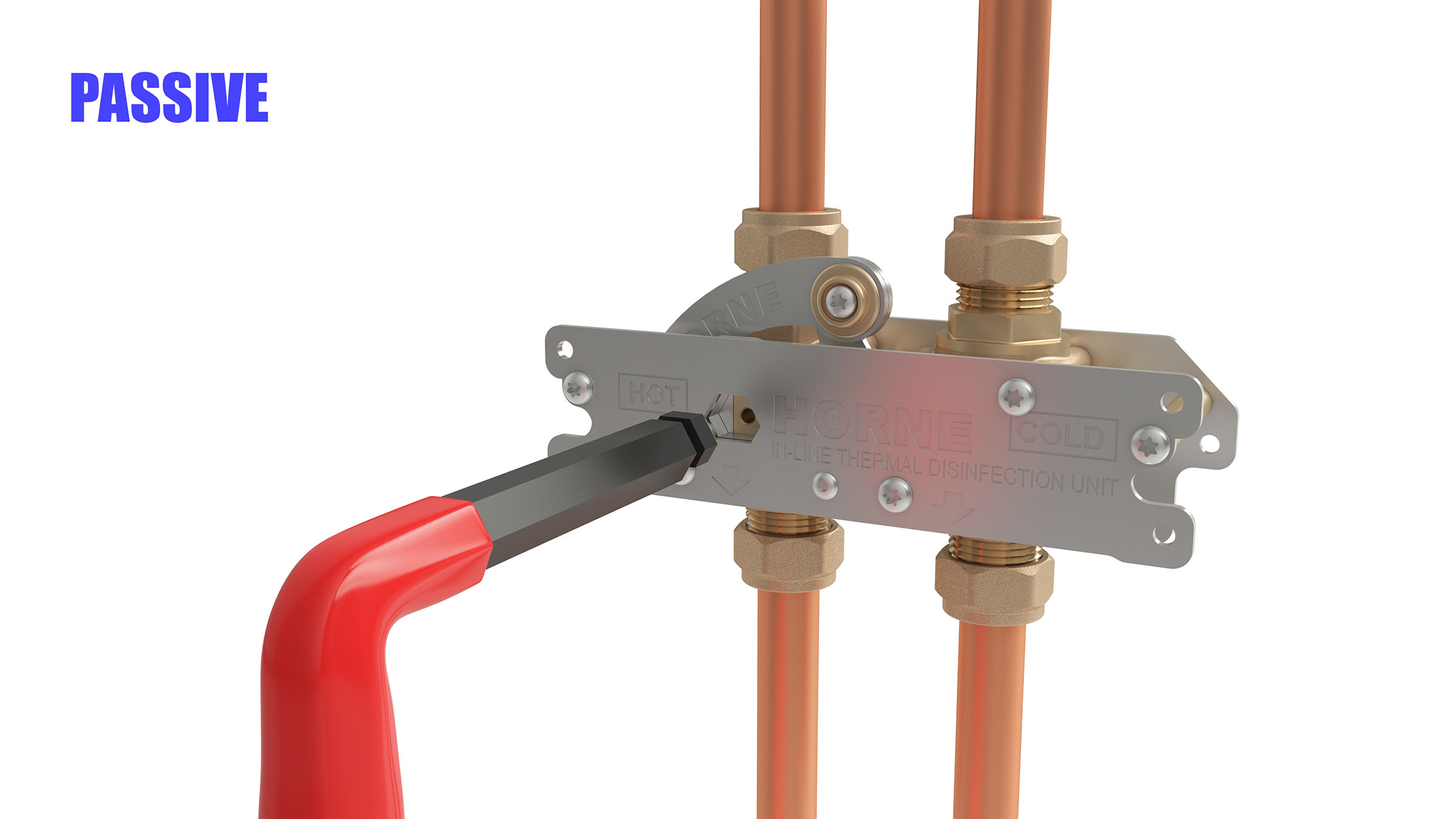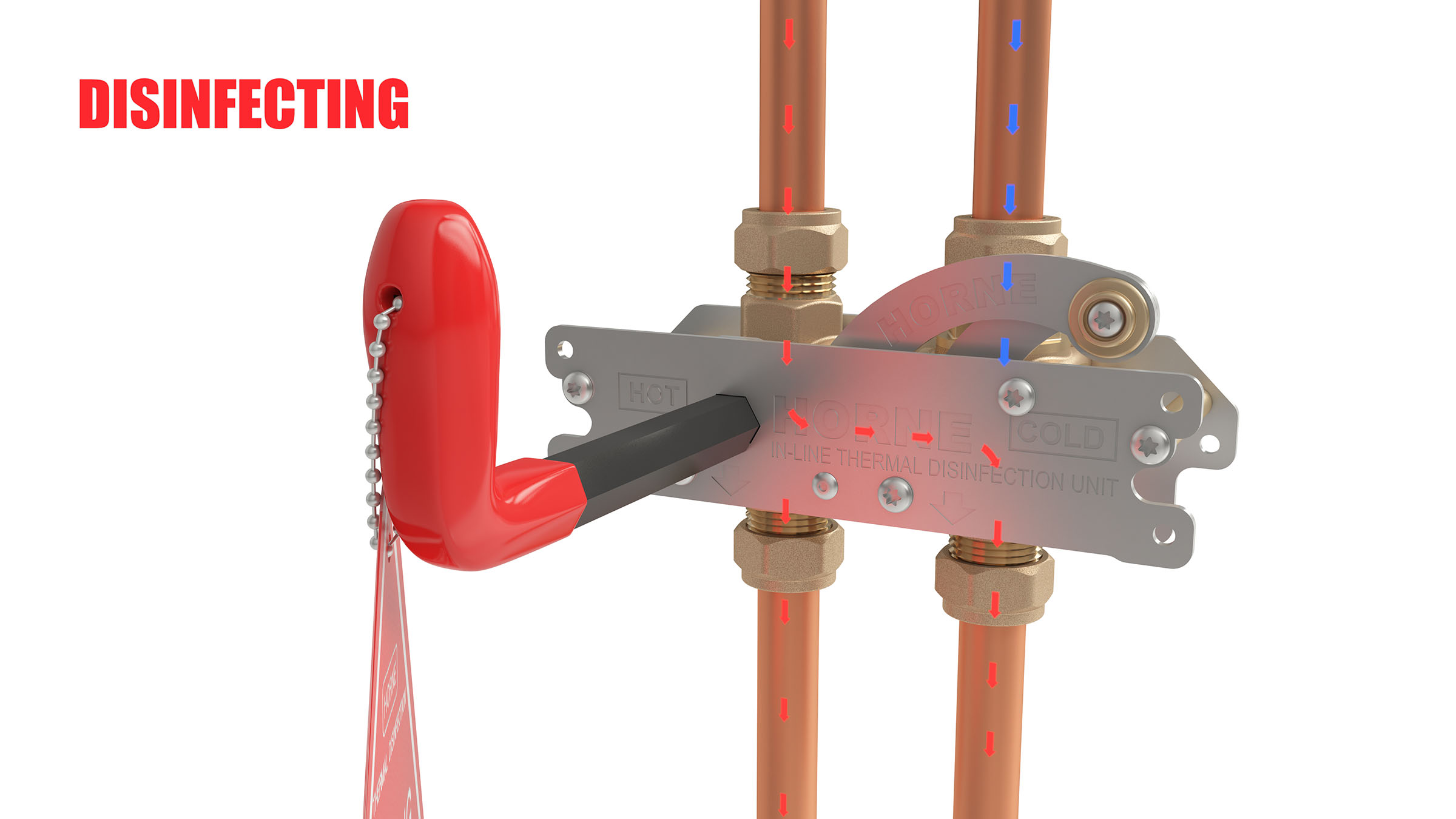 The patented ILTDU is an ingenious but simple device, that utilises two 3-way ball-valves and fits across the hot and cold pipework. It facilitates the temporary rerouting of the hot water supply down the cold-water supply pipe drop to the downstream thermostatic mixing device (thermostatic mixing valve – TMV, thermostatic tap or thermostatic shower valve). Under normal conditions of use, the ILTDU is a passive device, simply allowing passage of hot and cold water through its inlet and outlet ports directly to the downstream tap or showerhead. For the periodic thermal disinfection of the pipework and all downstream fittings, a bespoke key operates the 4-way link mechanism, which transfers the ILTDU from Passive Mode into Disinfecting Mode, changing the pathway of the hot water flow. With the outlet running, system temperature hot water can now enter the mixing device at its cold port. The active component in the mixing device, the thermostatic element, responds to this increase in temperature by expanding further, and pushing the proportioning slide-valve to close tightly over the hot water inlet port, and causing the cold port to open fully. In effect the TMV is tricked into allowing even more hot water to pass through, raising it and all wetting components and downstream fittings, to system temperature. Important Note: The fail-safe [sic] feature of the mixing valve, which shuts the hot supply in event of cold water-supply failure under normal operating conditions does not apply when the ILTDU is in Disinfecting Mode.